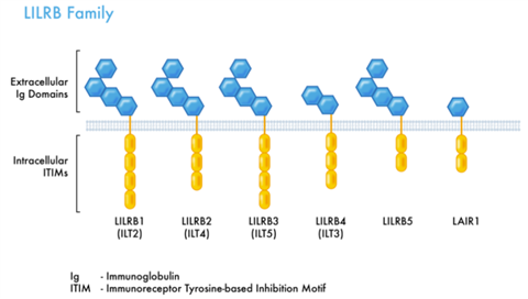 ? ? ? 白細(xì)胞免疫球蛋白樣受體 (The leukocyte immunoglobulin-like receptors, LILRs)?由抑制性LILR亞家族B(LILRB1-5)和激活性LILR亞家族A(LILRA1-6)組成。LILRB家族受體屬于I型跨膜糖蛋白,胞外區(qū)含有Ig樣結(jié)構(gòu)域,胞內(nèi)區(qū)含有免疫受體酪氨酸抑制基序(ITIM)結(jié)構(gòu)域,是免疫抑制性受體。LILRBs(LILRB1-5)主要在髓系細(xì)胞表達(dá),同時在腫瘤干細(xì)胞上也高表達(dá),并可能直接調(diào)控癌癥的發(fā)生和復(fù)發(fā)以及腫瘤干細(xì)胞的活性。LILRBs能抑制腫瘤免疫活性,并支持癌細(xì)胞在多種癌癥中存活,促進(jìn)腫瘤生長和轉(zhuǎn)移。