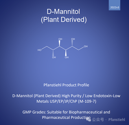 Pfanstiehl品牌D-甘露醇,秉承一貫高品質(zhì)理念,按照ICHQ7質(zhì)量體系生 產(chǎn),具有高純度,超低內(nèi)毒素,超低微生物含量的特點,并單獨檢測29種金屬離子含量(ppb水平),符合多國藥典,滿足生物制藥和疫苗對于注射級別甘露醇的生產(chǎn)要求。