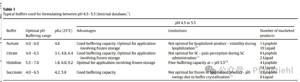 盡管在液體和凍干產(chǎn)品中,組氨酸在pH 5.5至6.5的范圍內(nèi)都占據(jù)主導地位,但如果目標pH值在4.5至5.5之間,我們依然還有另外三種緩沖液可選,即醋酸鹽、檸檬酸鹽和琥珀酸鹽。這些緩沖物質(zhì)存在某些固有的挑戰(zhàn),阻礙了它們在靜脈和皮下給藥以及液體和凍干劑型方面的廣泛使用。而組氨酸的pKa值為6,在pH<5.5時緩沖性較差,因此在4.5至5.5的pH范圍內(nèi)應用有限。雖然醋酸鹽在此范圍內(nèi)具有良好的緩沖能力,但其易揮發(fā)和冷凍干燥過程中溶劑的過度損失是其應用相關(guān)的潛在挑戰(zhàn)。檸檬酸鹽緩沖制劑在皮下應用中使用有限,原因是在皮下注射期間存在壞死的風險。琥珀酸鹽在pH4.5至5.5之間提供了強大的緩沖能力,但由于琥珀酸鹽結(jié)晶影響產(chǎn)品穩(wěn)定性而導致pH值劇烈波動的風險,通常避免其用于冷凍或凍干的應用。以下表格總結(jié)了在注射制劑中使用這四種緩沖液的局限性[1]。
