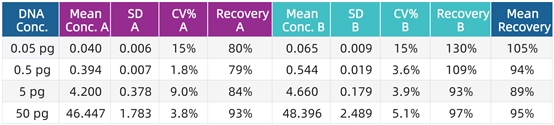 準確性與可重復性測試。由兩名操作員(A和B)分別在兩天內對已知DNA樣本進行兩次檢測,計算檢測結果的SD, CV和回收率%(見下表)。
