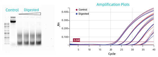 完整的和不同程度降解的CHO DNA的提取與擴增效果對比。將完整的gDNA(Control)與分別用Alu1酶處理30min、1h、1.5h和2h后的DNA(Digested)凝膠電泳圖像。對照組和酶處理30min組樣品擴增的線性范圍基本一致(如下圖)。