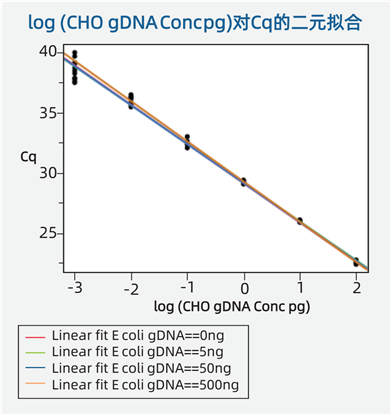 存在外源DNA的情況下,CHO引物/探針仍具有廣泛的線性范圍和特異性。不同濃度的E. coli DNA不會影響CHO DNA的標準曲線(如下圖)。