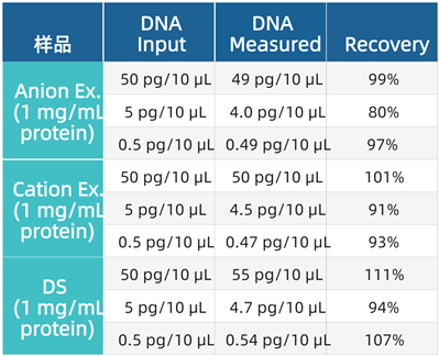 過程樣品與藥物原液(DS)檢測結果對比。對比含有1 mg/mL陰離子交換或陽離子交換純化的蛋白樣品或藥物蛋白的CHO DNA回收率(見下表)。