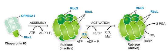 CO2的固定是利用光反應(yīng)產(chǎn)生的ATP和NADPH合成有機(jī)物的過程,該過程稱為卡爾文循環(huán)。1,5二磷酸核酮糖羧化/加氧酶(Rubisco)是CO2固定過程中的關(guān)鍵限速酶,催化CO2和RuBP(核酮糖-1,5-二磷酸)發(fā)生羧化、然后裂解形成兩個PGA(甘油酸-3-磷酸)分子。所有光合生物都具有由8個大亞基RbcL和8個小亞基Rbcs組成的I型Rubisco,且RbcL折疊到其天然狀態(tài)依賴于葉綠體定位的分子伴侶CPN60的作用。