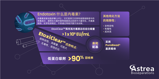 本文將推薦一款來自英國Astrea Bioseparations的Etoxiclear?層析介質(zhì),它是一種高性能、非離子交換、合成的親和層析吸附劑,可經(jīng)濟高效地去除內(nèi)毒素,支持GMP生產(chǎn),有凝膠和一次性預(yù)裝柱兩種形式產(chǎn)品,滿足不同的工藝需求。