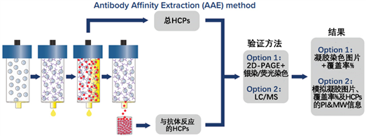 AAE分析流程首先將多克隆抗體共價固定在色譜柱上。然后對色譜柱進(jìn)行條件調(diào)節(jié),以防止抗體的顯著浸出并極大地減少任何非特異性結(jié)合。原始未變性的HCPs樣品通過色譜柱與抗體進(jìn)行結(jié)合,隨后用酸洗脫。通過結(jié)合和洗脫,HCPs樣品再次在柱上循環(huán),直到?jīng)]有其他HCPs被結(jié)合。所有收集的HCPs洗脫液再匯集、交換緩沖液并濃縮回原始樣品體積,為后續(xù)的分析提供高質(zhì)量的樣本。在收集到HCPs樣本后,可以選擇通過2D-PAGE+銀染或MS質(zhì)譜進(jìn)行后續(xù)分析。