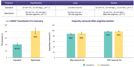 用0.8M精氨酸洗脫,HSV回收率可達到69%,LentiHERO®載量可達1.4E+8 IU/ml,同時實現(xiàn)高效的雜質(zhì)去除。