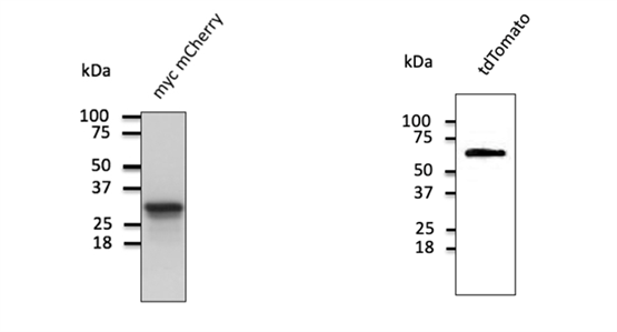The Anti-mCherry and Anti-tdTomato antibodies provided by SICGEN (distributed by XMJ) are both polyclonal antibodies targeting red fluorescent proteins extracted from?Discosoma?(disc corals). The antigens of these two antibodies (Anti-mCherry and Anti-tdTomato) are both purified from recombinant polypeptides expressed in?Escherichia coli?(E. coli). When Western blot is used to detect HEK293 cells transfected with the two proteins (mCherry and tdTomato), bands of 29 kDa and 55 kDa can be detected respectively. The Anti-tdTomato antibody exhibits specificity for both tdTomato and mCherry, but does not cross-react with green fluorescent?