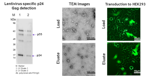 Figure 6. Through Western Blotting (WB), electron microscopy, and cell infection assays, comparisons were made between lentiviruses before and after purification by Nereus LentiHERO?. The results showed that the integrity of lentiviral structural proteins, particle shape and size, and infectious activity were not significantly affected.