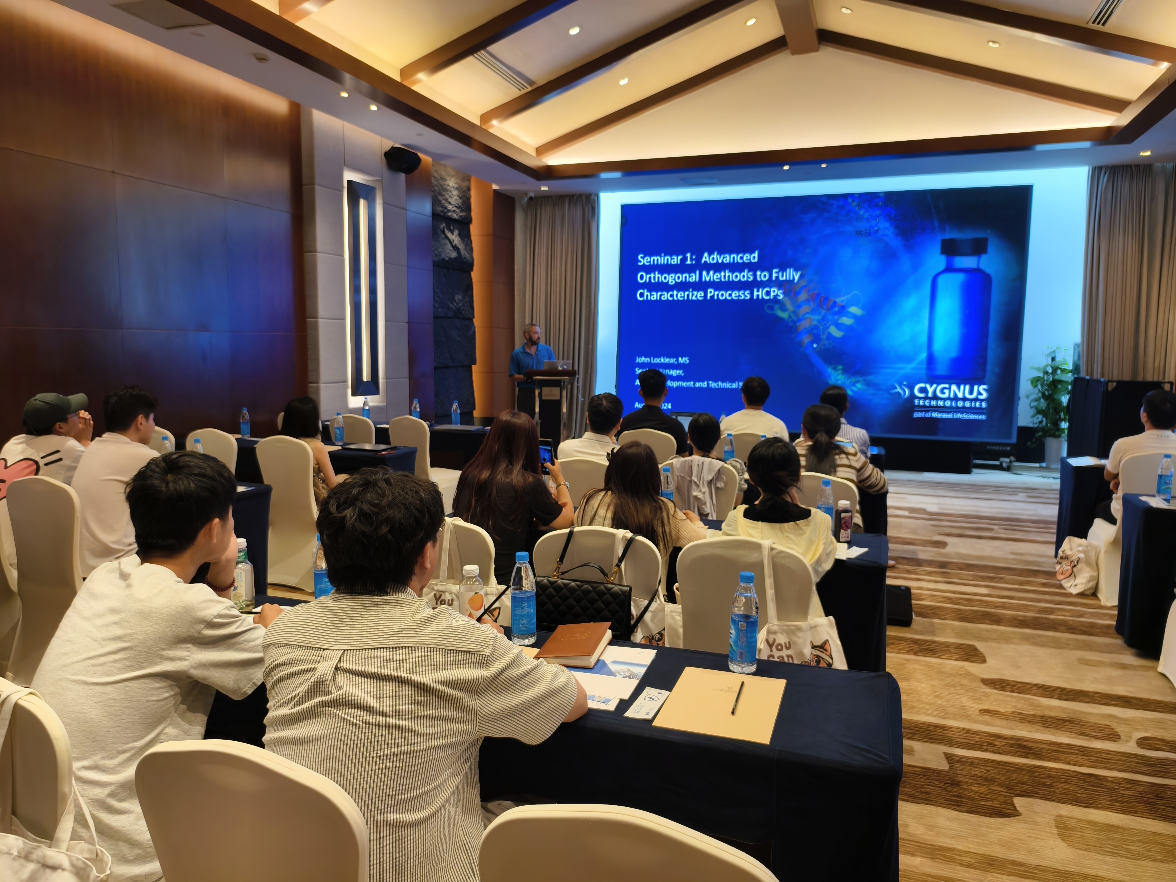 The seminars invited John Locklear, Senior Technical Manager of Cygnus, and Dr. Fang Weijie, Researcher from Zhejiang University, as guest speakers. They jointly elaborated on the detection methods and latest research progress related to the quality control of protein-based biologics, and shared successful experiences and practical cases, covering aspects such as?process-related and drug-related HCPs (Host Cell Proteins) characterization and analysis,?bridging strategies for two HCP analysis methods,?application of Capillary Gel Electrophoresis (CE-SDS), and?new detection methods for Protein A and Protein L residuals. The seminars attracted many experts from the biopharmaceutical industry; attendees actively communicated and discussed during the events, creating a lively atmosphere.