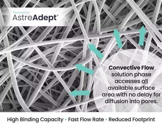 近年來,隨著CGT領域的興起,病毒載體的純化面臨著諸多技術瓶頸,Astrea Bioseparations 致力于開發(fā)一種用于病毒載體高效純化的新型生物分離材料AstreAdept®。AstreAdept ®是一種靜電紡絲復合納米纖維層析膜,具有較大的開放結構,幾乎可以瞬時結合大目標(包括病毒載體)到更大的結合表面積。